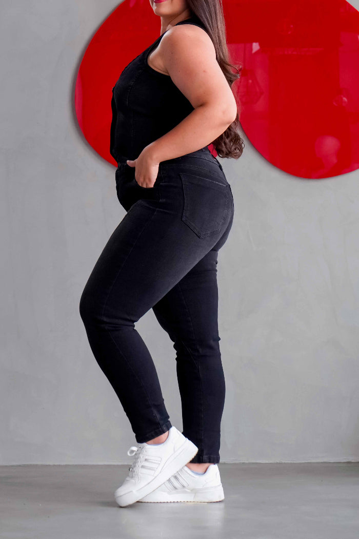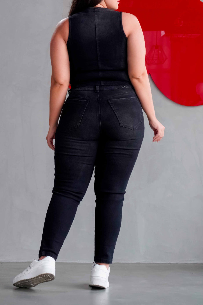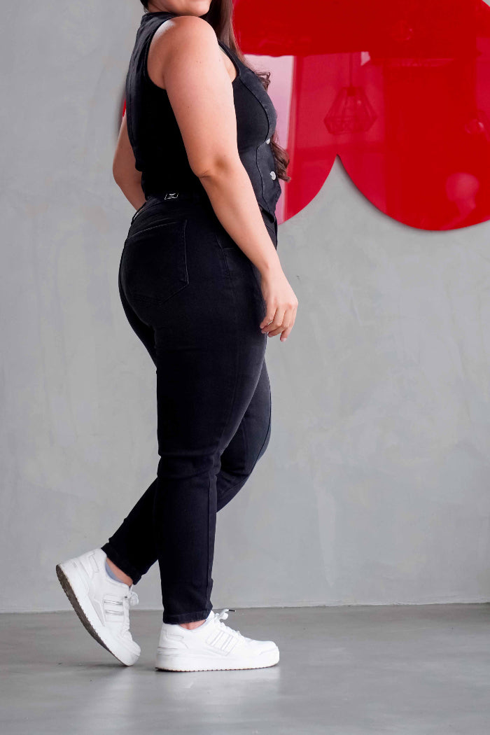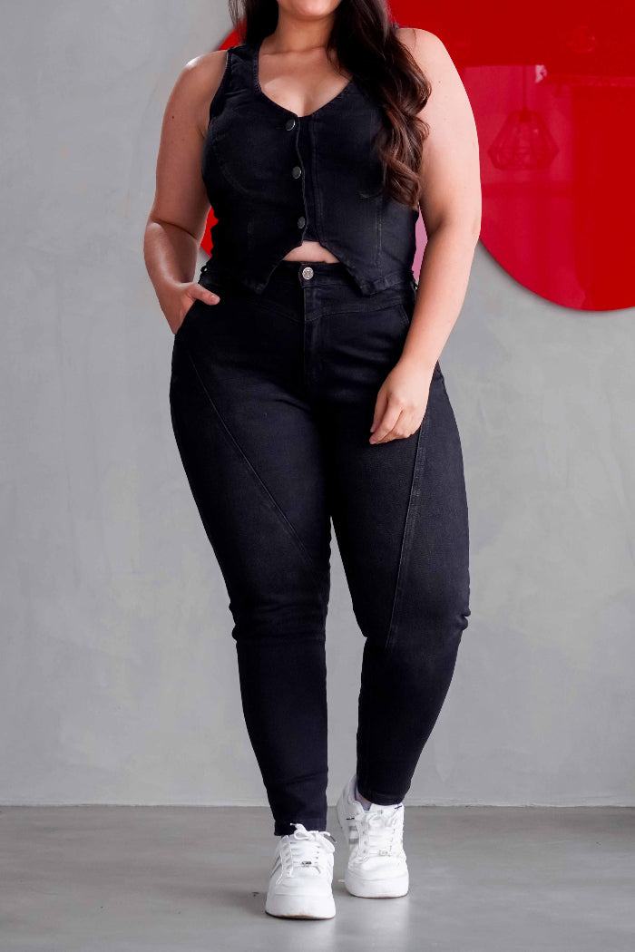 Conjunto de Jeans Baggy combinado con un chaleco negro en denim stretch