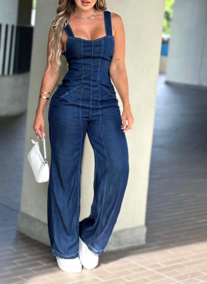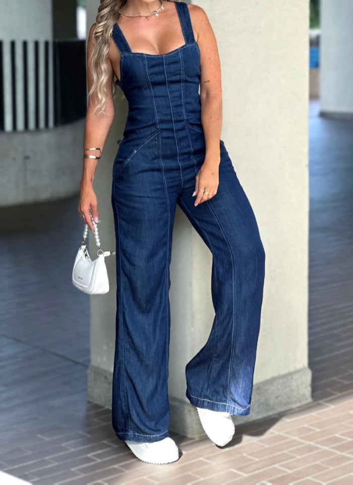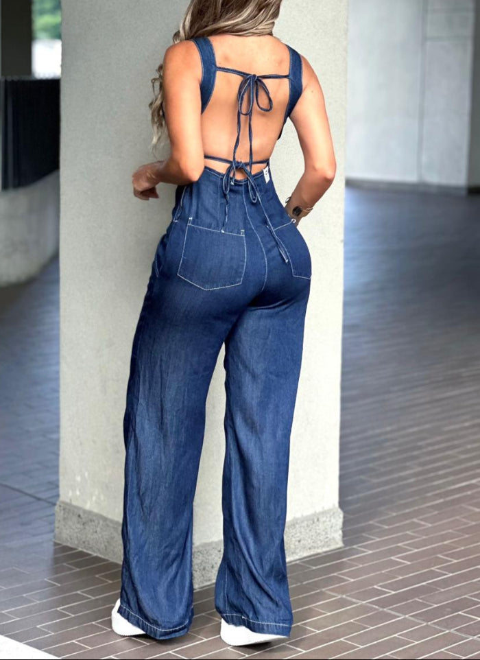 Este enterizo largo está confeccionado en tela catarral chambray tencel, con un escote en la espalda de tiras que aporta un toque único.