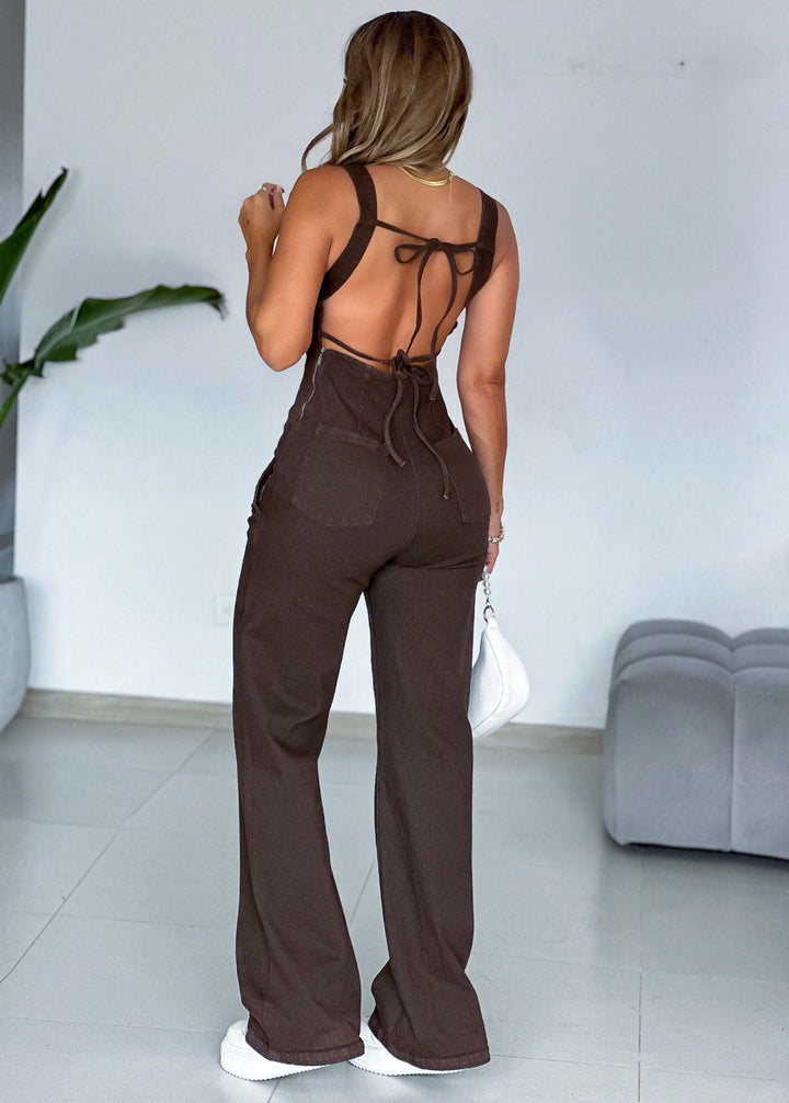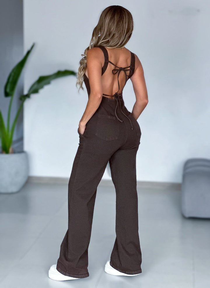 Este enterizo largo de dril licrado, con pierna recta, está disponible en sofisticados tonos flan y chocolate.