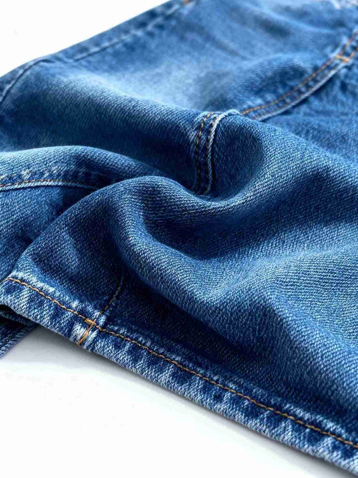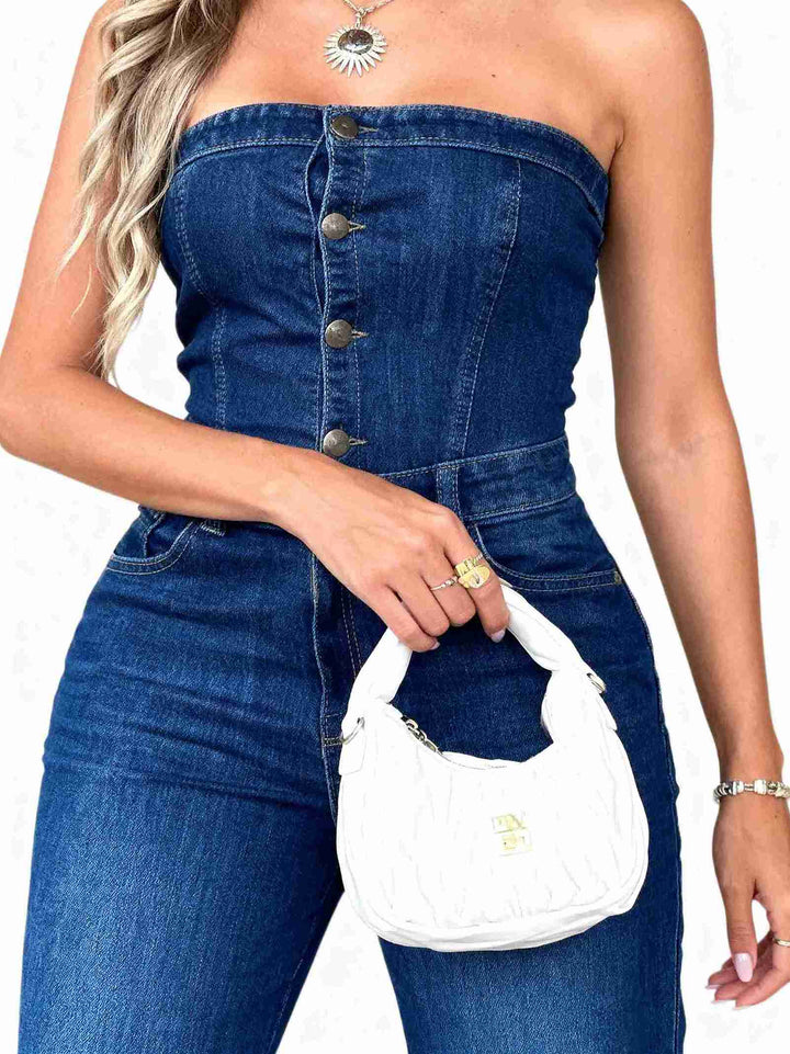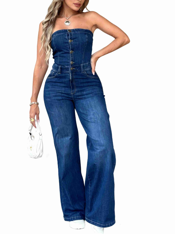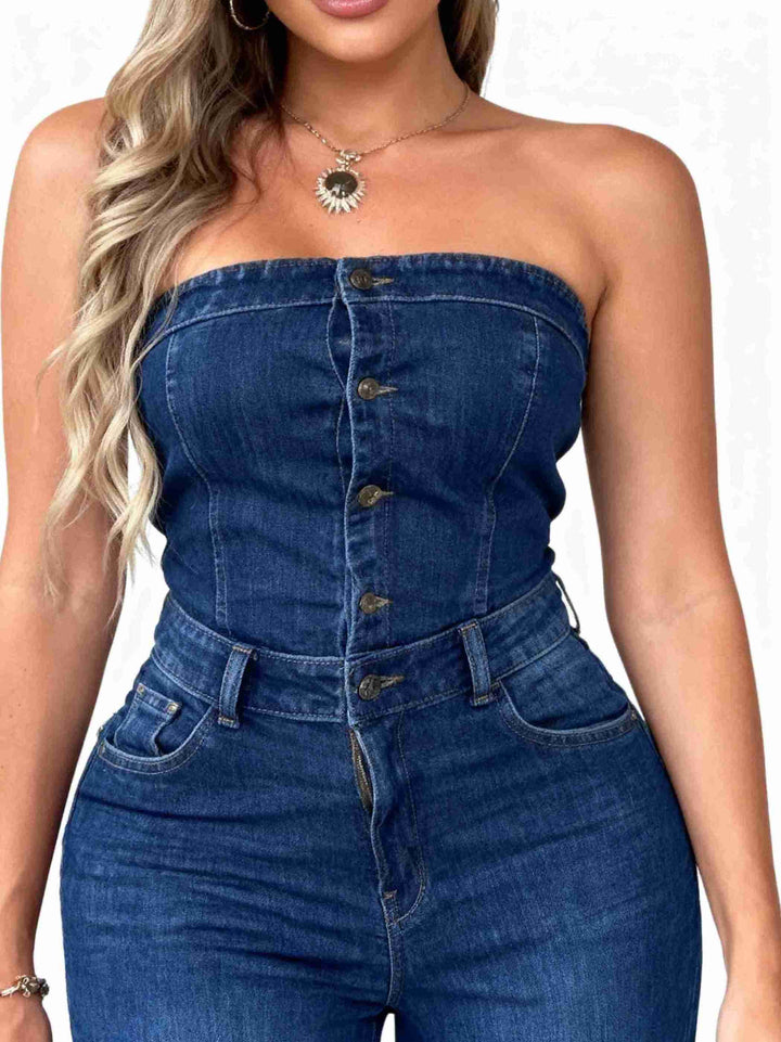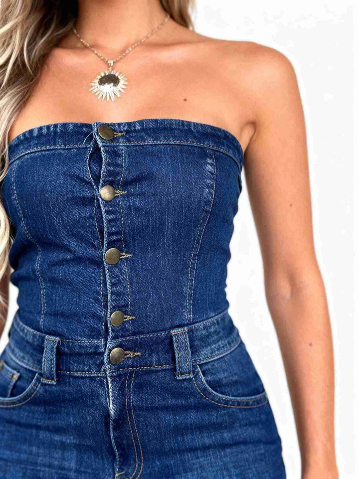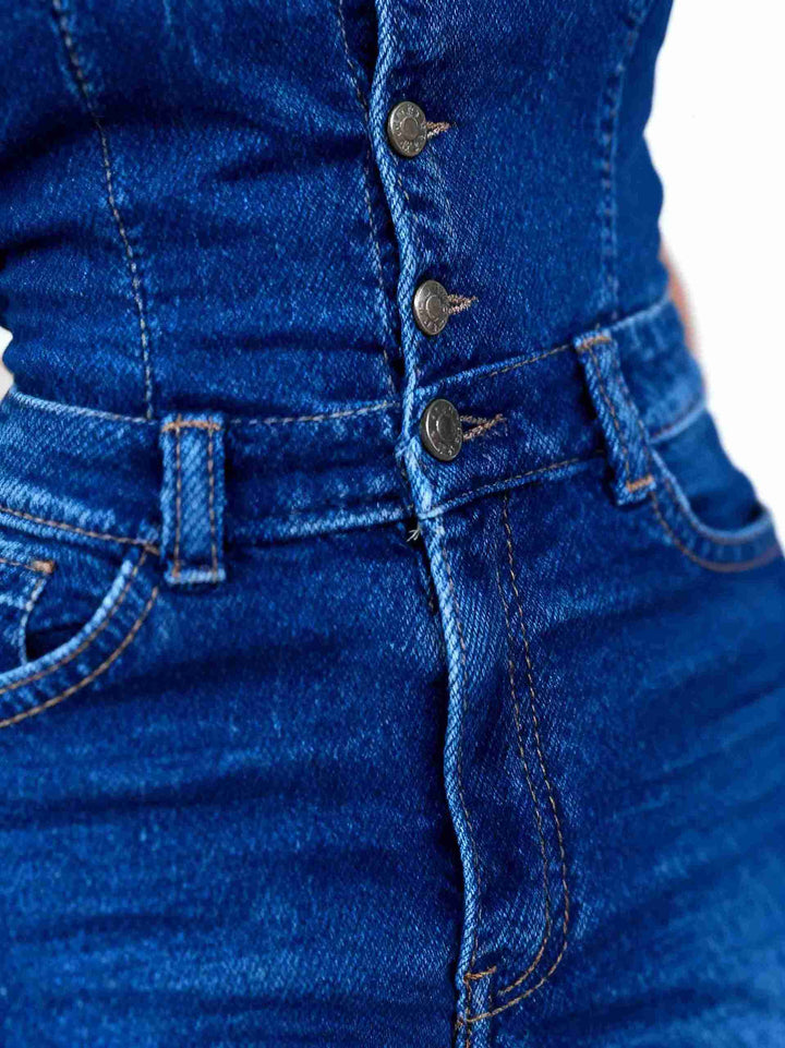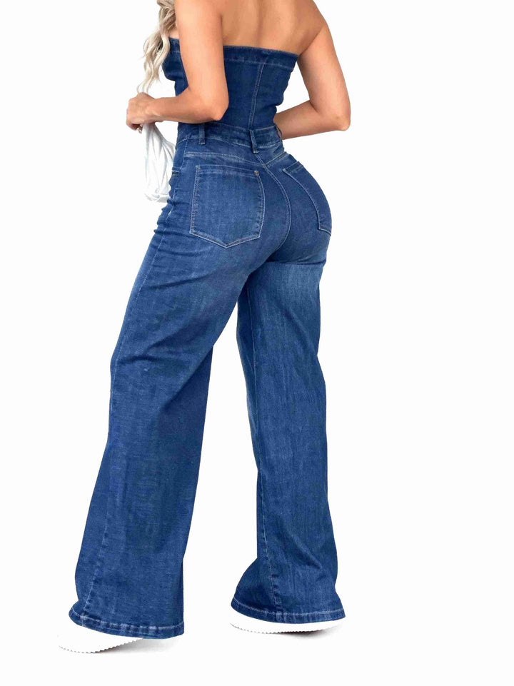 Enterizo Palazzo Straples en denim licrado, con pierna ancha y ajuste de botones en la parte superior, diseñado para realzar tu figura con una caída impecable y un ajuste cómodo en la cintura.