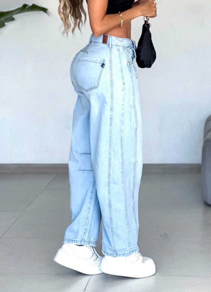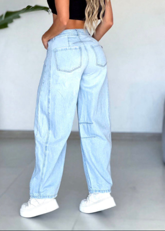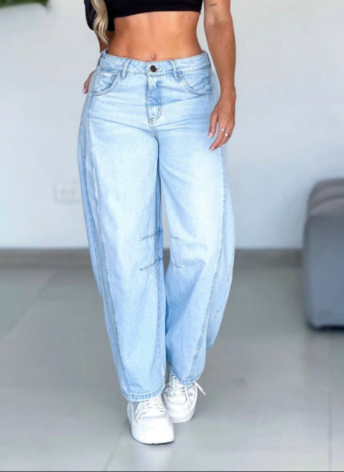 Jean barrel confeccionado en denim rígido de tono claro que realza tu estilo con detalles sutiles en la caída de la bota