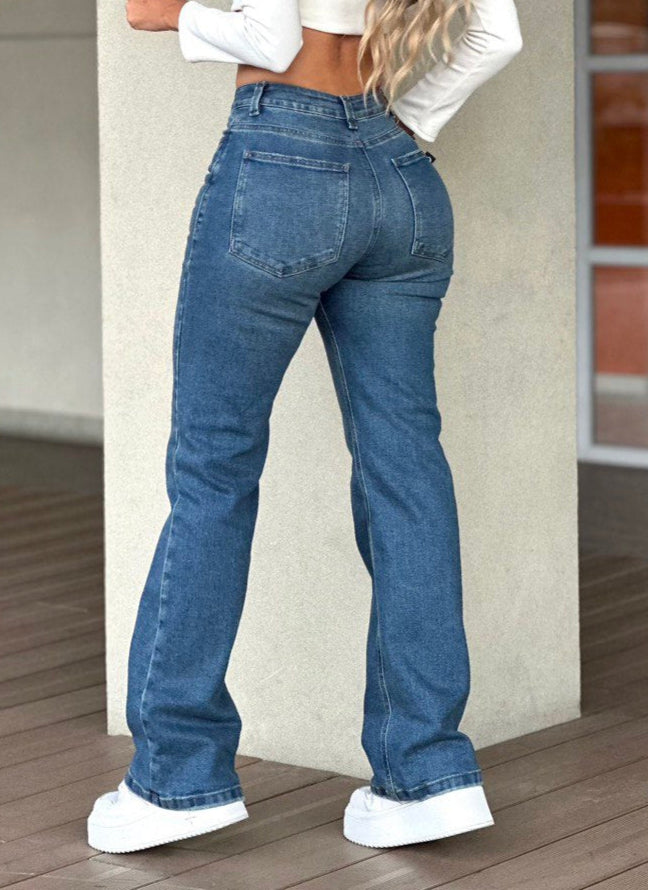 El Jean Bota Recta en Denim Stretch destaca por sus discretos bolsillos y tiro alto, ofreciendo un ajuste perfecto que realza tu silueta.
