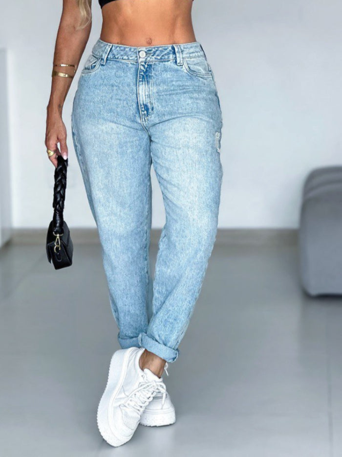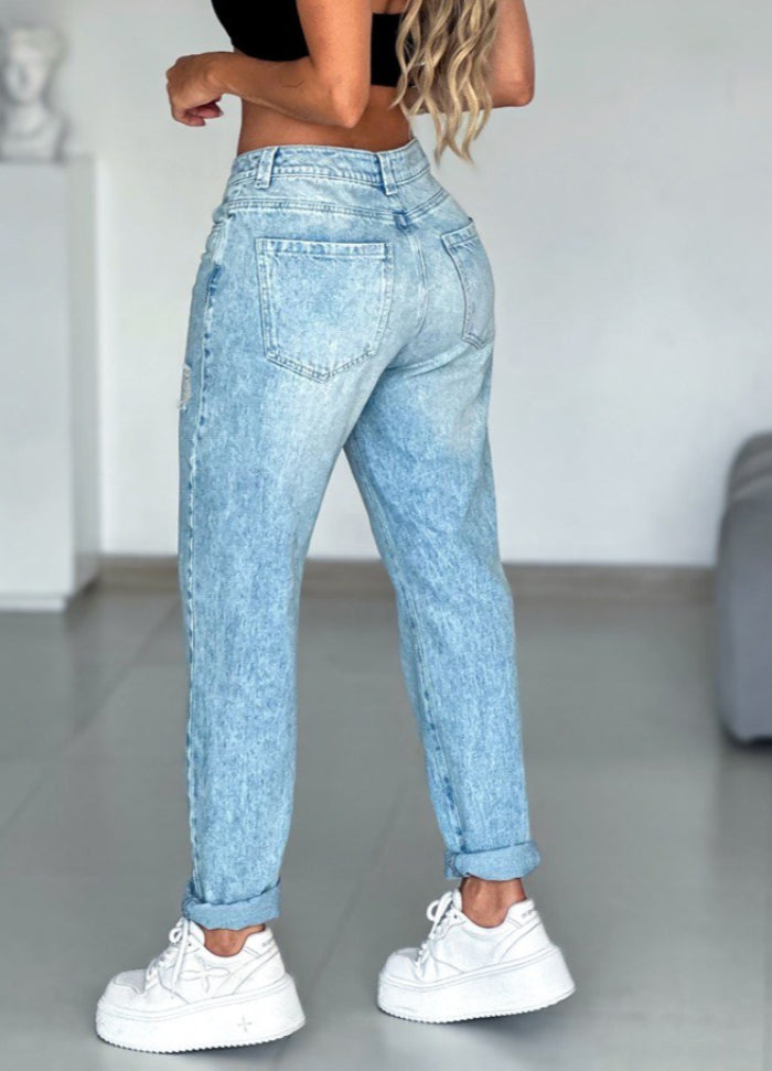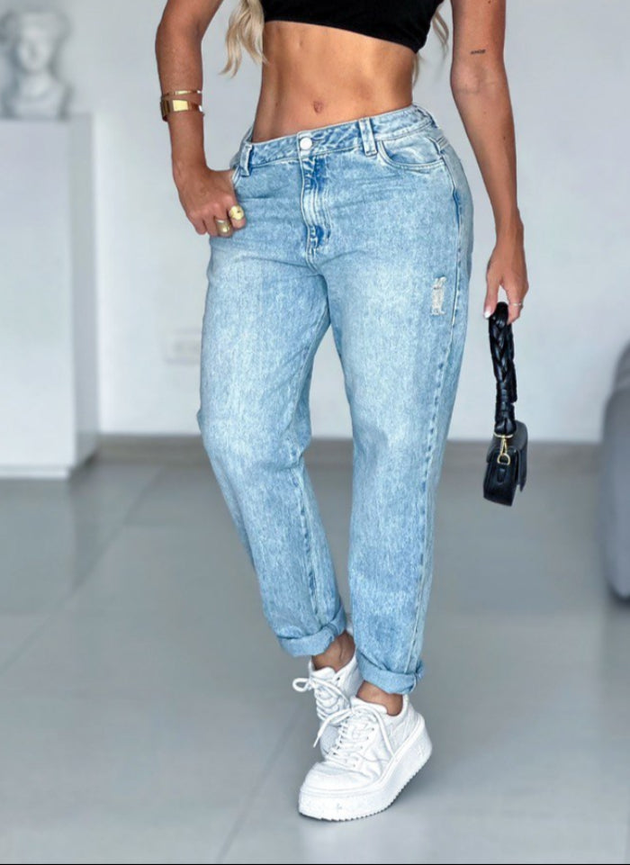 Este jean boyfriend en denim rígido destaca por sus detalles únicos en el color, que le aportan un toque especial y diferente. talla del 4 al 14