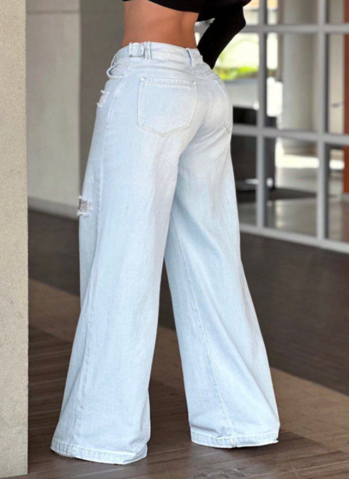 Este jean de pierna ancha está elaborado en denim rígido 100% algodón, con sutiles desgastes, en un elegante tono hielo y tiro alto que realza la figura.