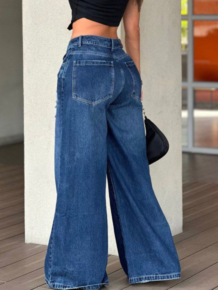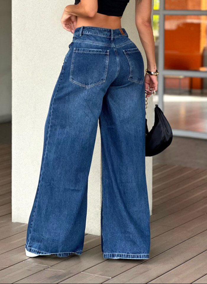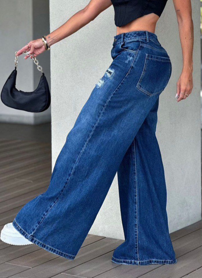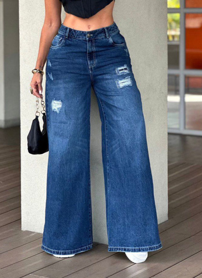 Jean Palazzo de pierna ancha confeccionado en denim rígido 100% algodón, con delicados desgastes que realzan tu estilo.