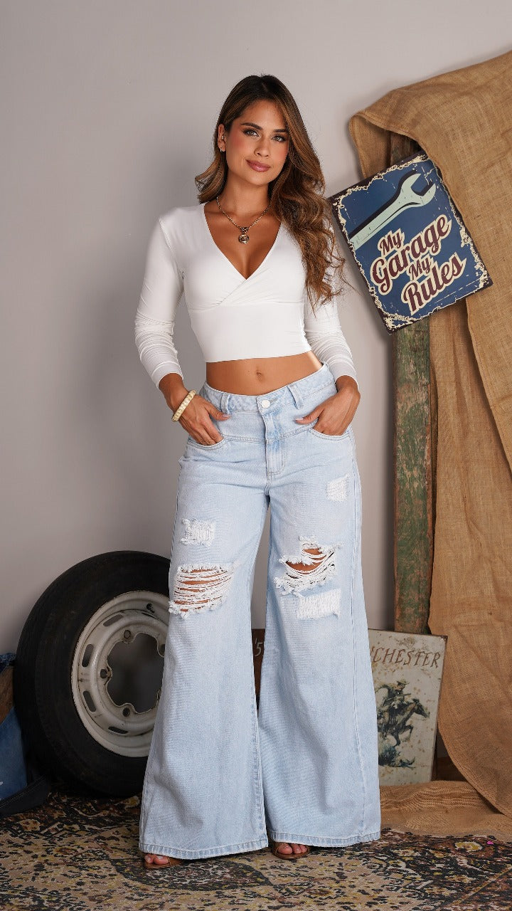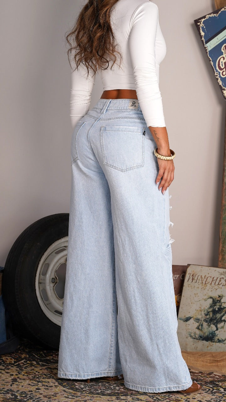 Jean wide leg confeccionado en denim rígido, con sutiles desgastes frontales que aportan un toque rebelde y auténtico.