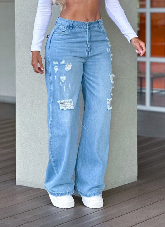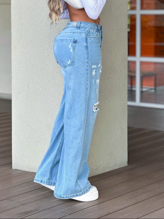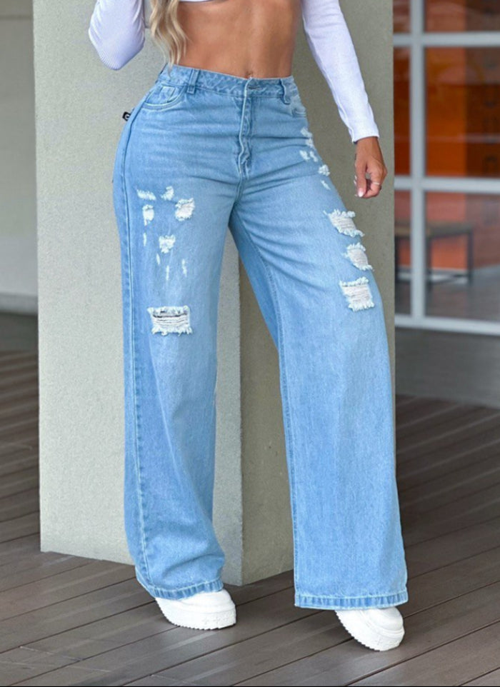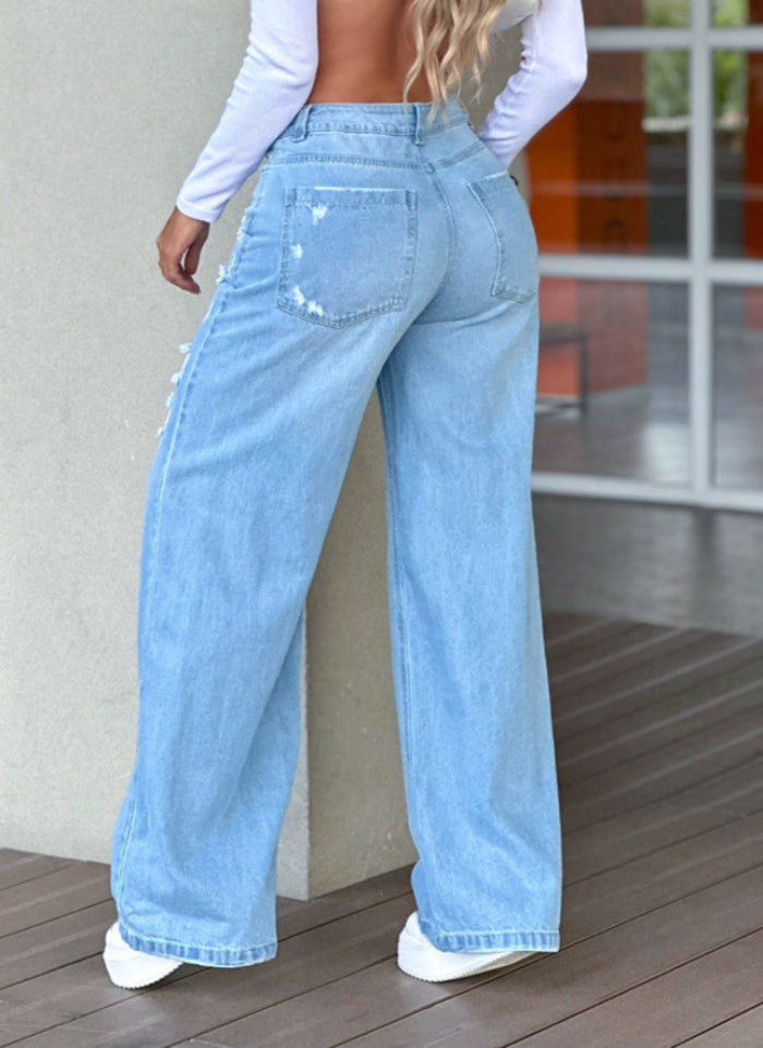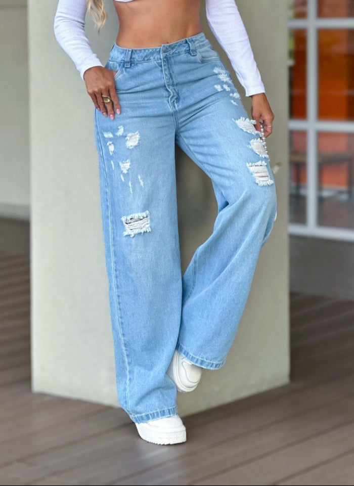 Jean wide leg con delicados desgastes frontales, confeccionado en denim rígido que combina moda y comodidad.