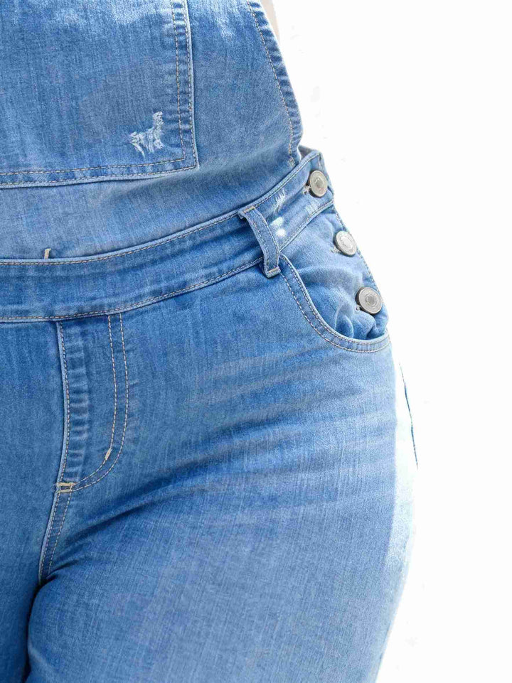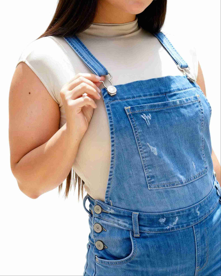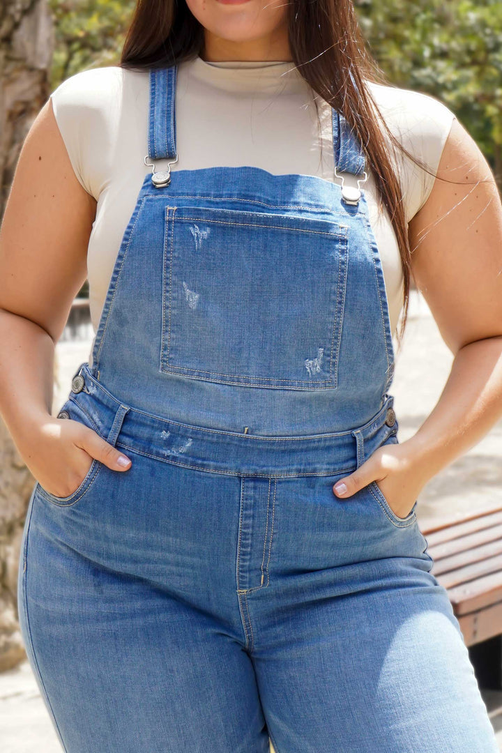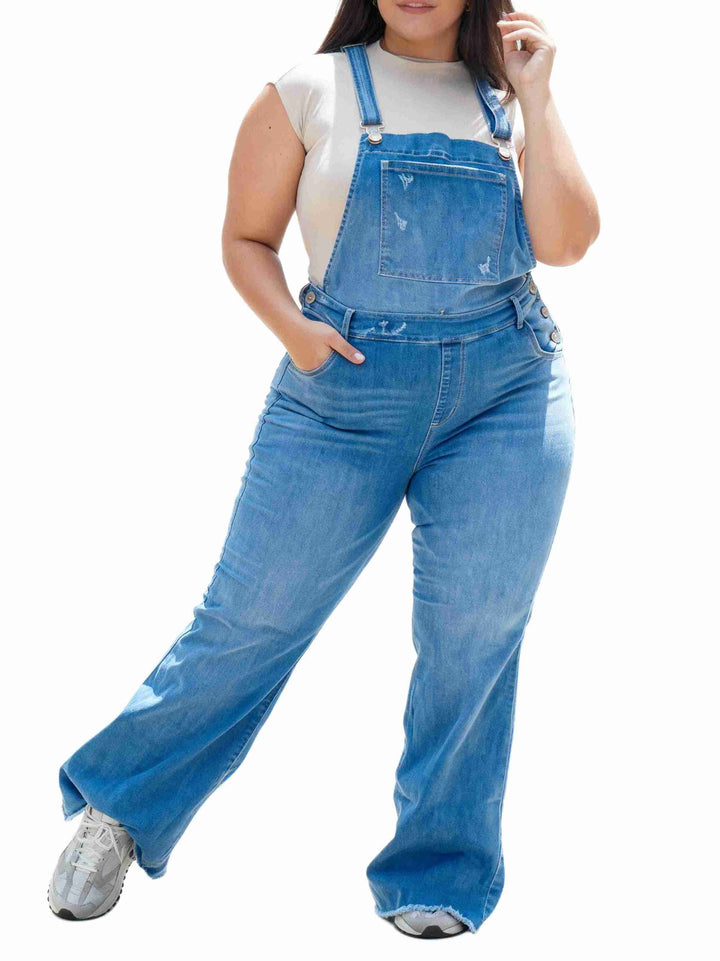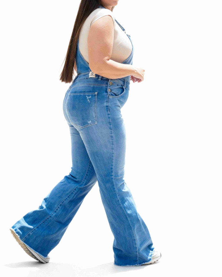 El overol flare curvy en denim stretch, disponible en tallas 14 a 22, ofrece un ajuste perfecto que realza tu figura y resalta tu feminidad.