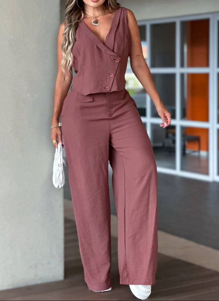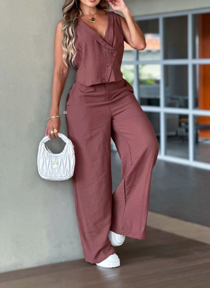 Este conjunto incluye un pantalón de bota recta y ancho, acompañado de un chaleco con un delicado escote y botones ligeramente inclinados.