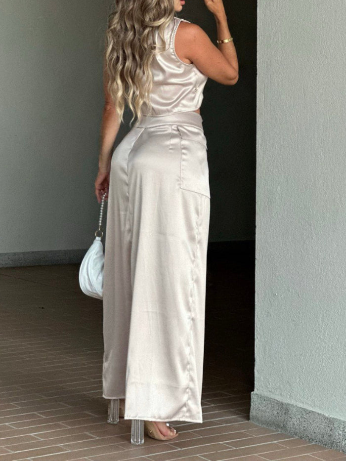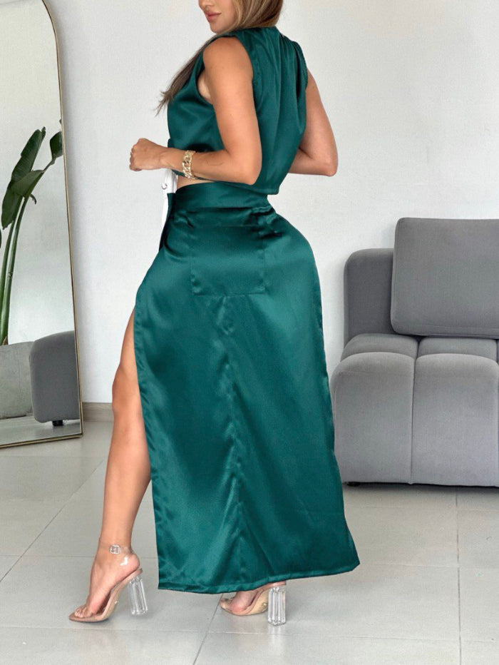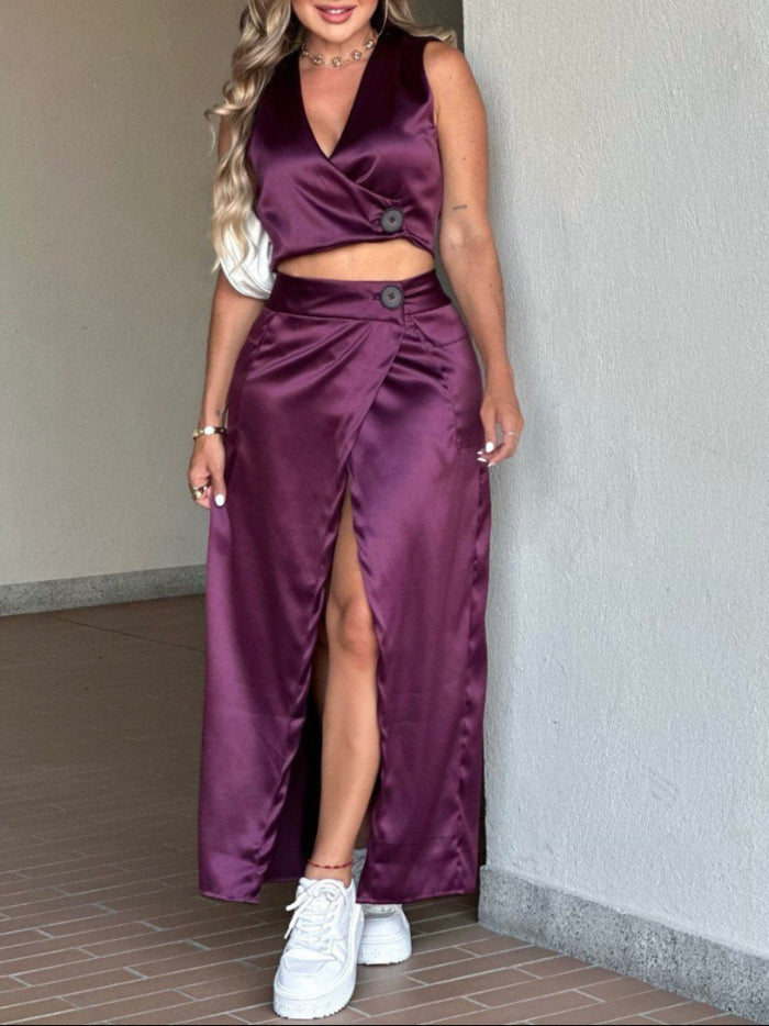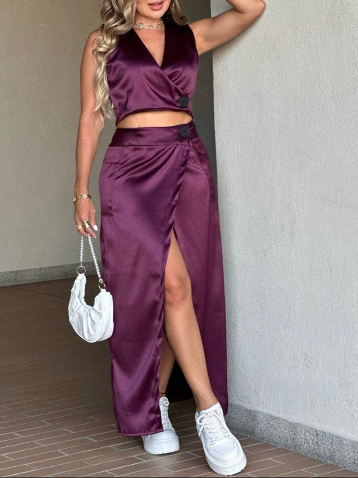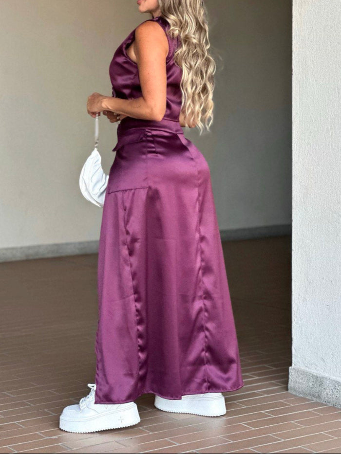Este conjunto de falda y blusa está confeccionado en un tejido plano delicado de satén mate, disponible en tonos actuales como arena, vino tinto y verde.