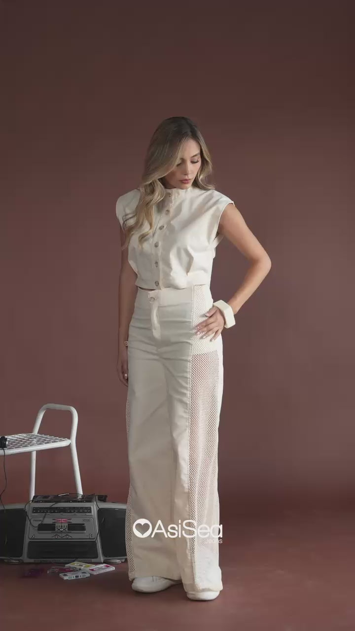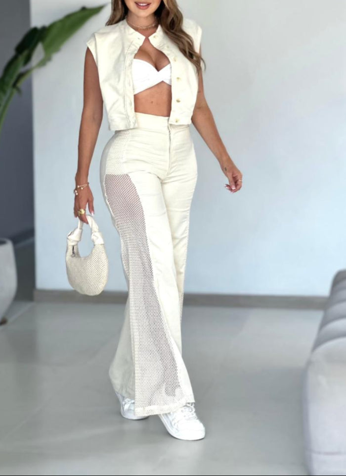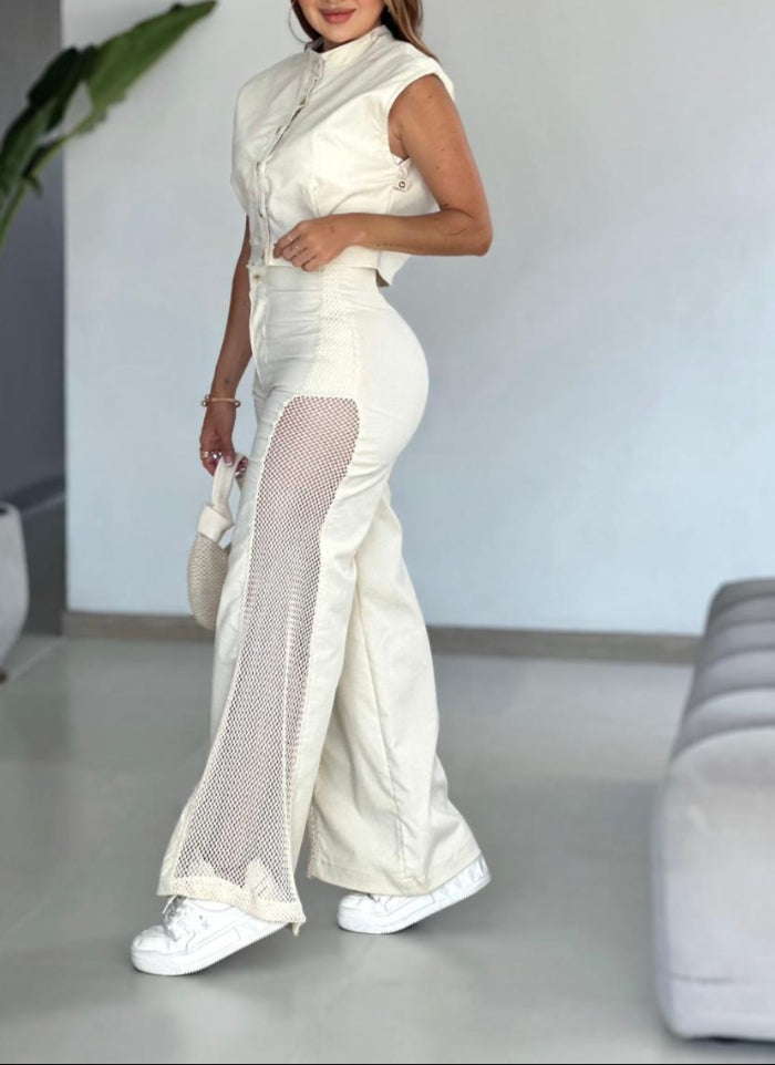 Disfruta de este conjunto de dos piezas que incluye un pantalón combinado con malla, único y exclusivo para ti, confeccionado en tela dril confort en un elegante tono marfil.