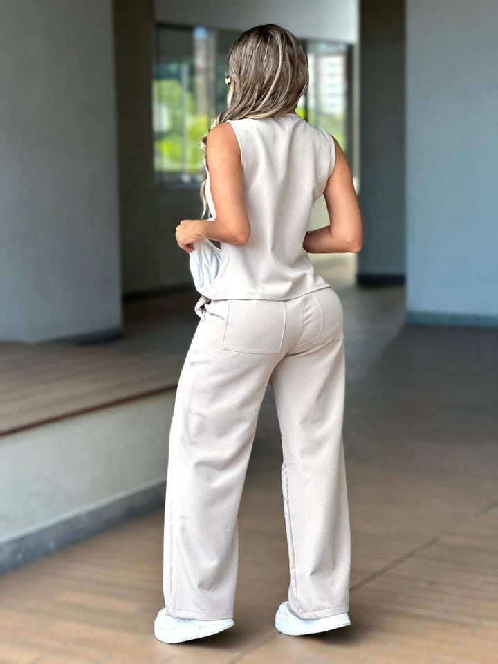 Combina un pantalón de corte recto y un chaleco en tejido plano ligero, elaborado con 96% poliéster y 4% spandex, disponible en sofisticados colores en tendencia como lo es vino tinto y caqui