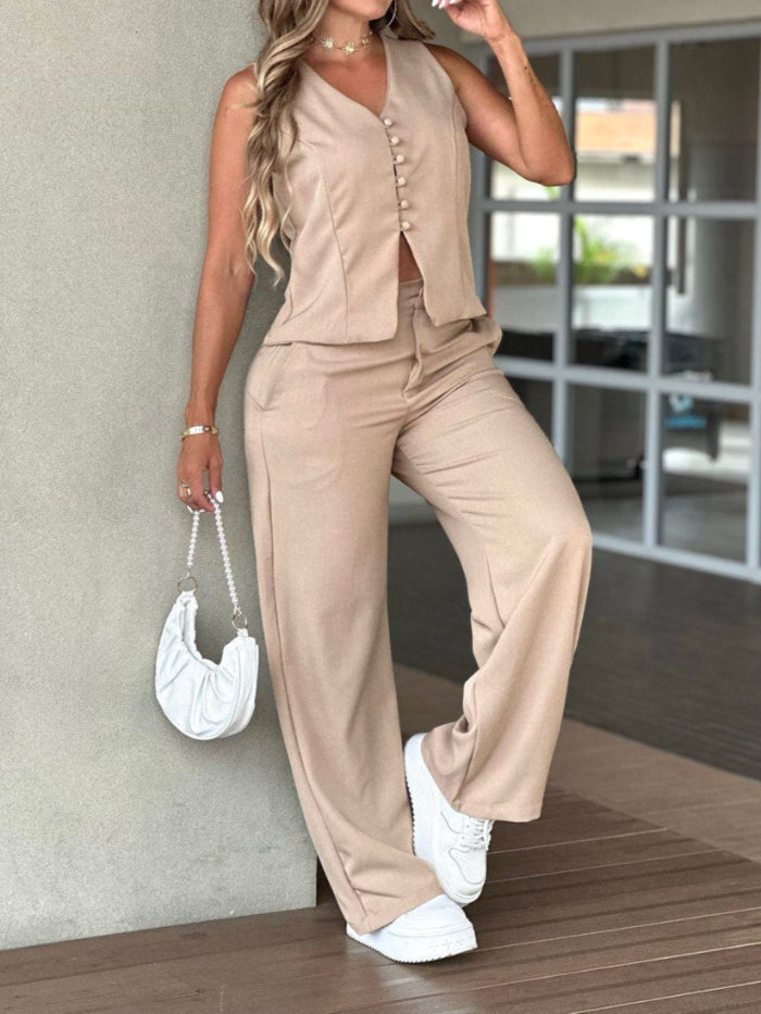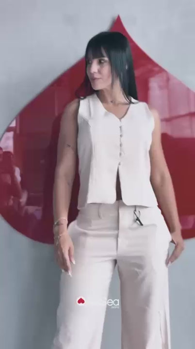 Set compuesto por pantalón y chaleco en tejido plano ligero, perfecto para resaltar tu estilo elegante con colores de moda.
