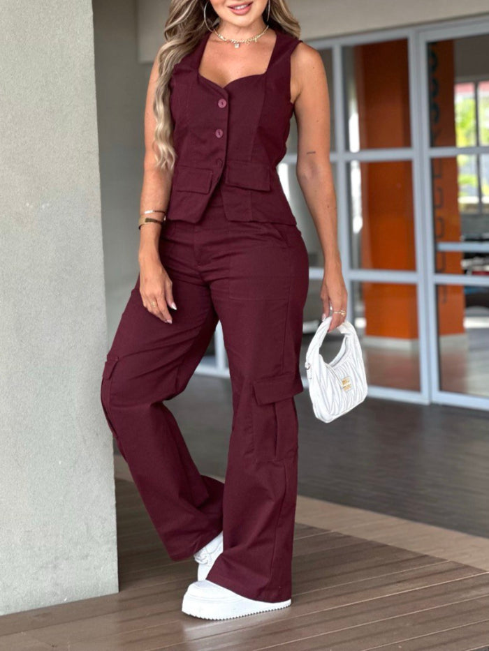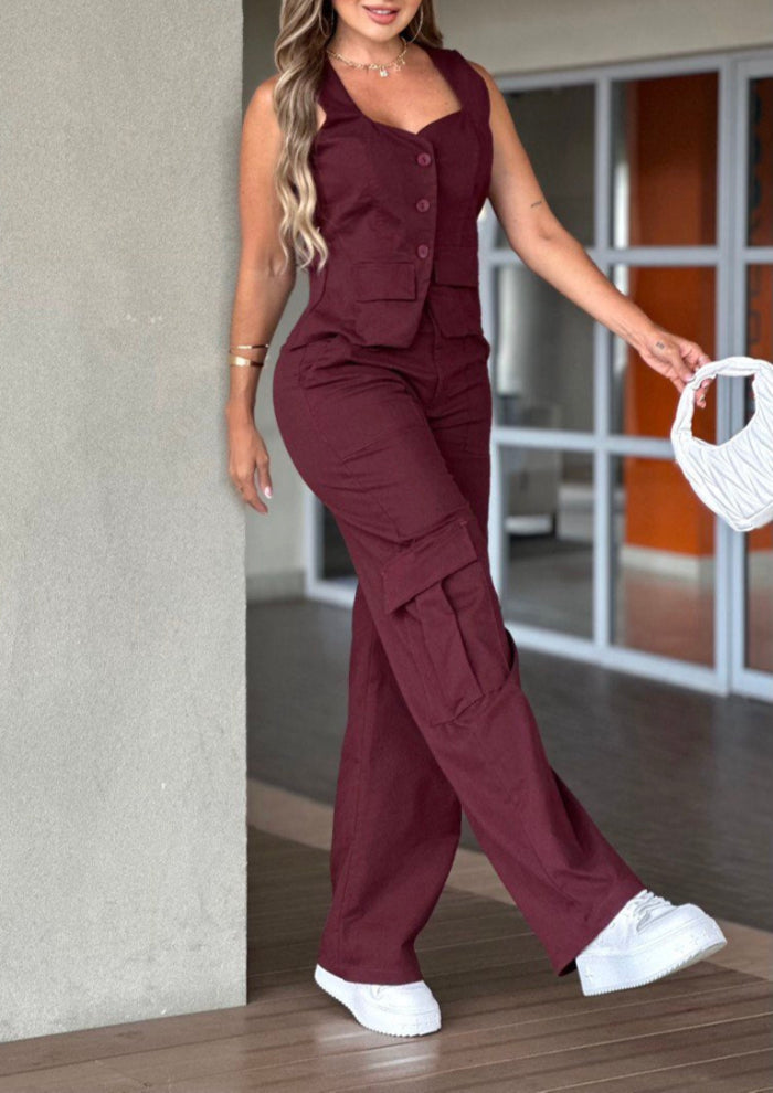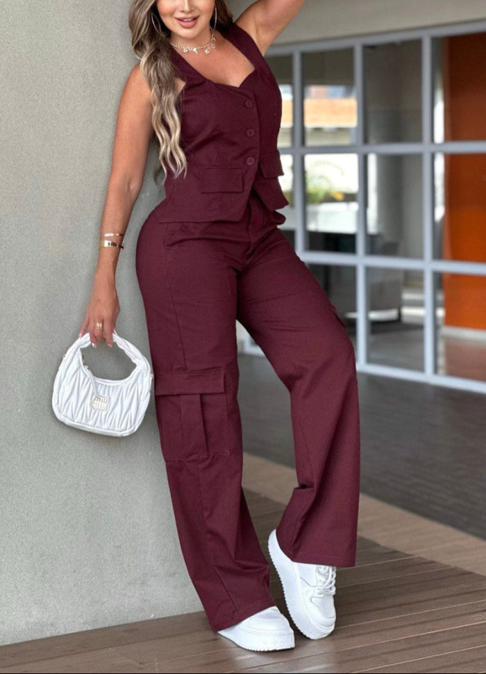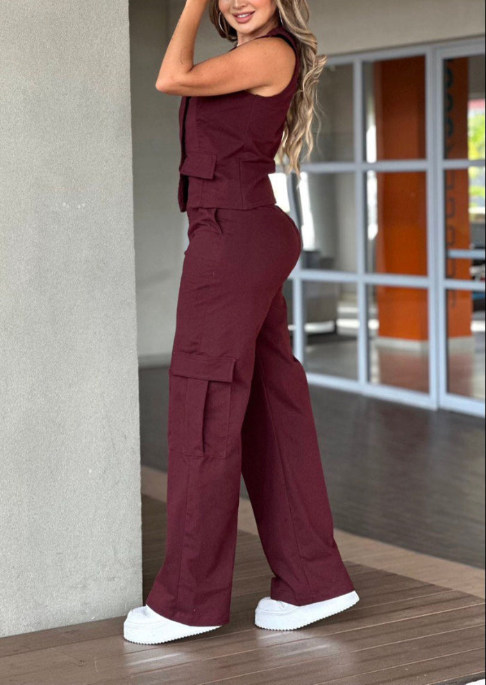 Set compuesto por pantalón y chaleco en Drill Licrado, disponible en los colores de moda café y vino tinto.